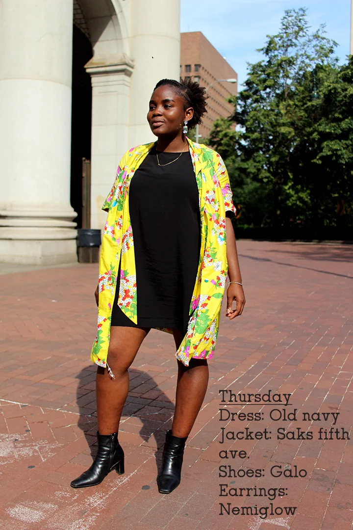 Rounding off the week, I kept things colorful and bright. I'd been dying to wear that Saks robe/jacket to work and I finally managed to pull it off with a simple black dress and holographic earrings. Around the end of the week, I generally put the least thought into my outfits because y'know the week is almost over. Generally, I just slip on a dress and some cool accessories to tie it all up.