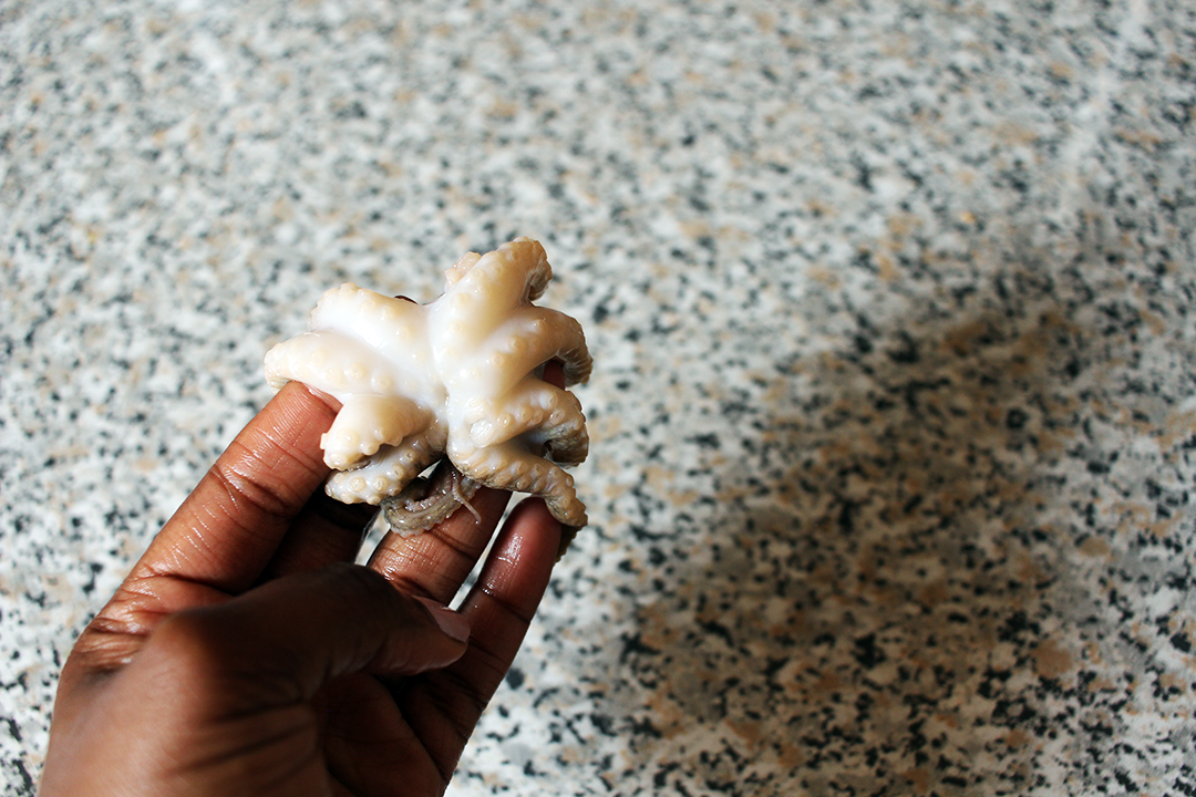 - In a pot of boiling heavily salted water, add the cleaned baby octopus and cook on low-medium heat for 1 hour.