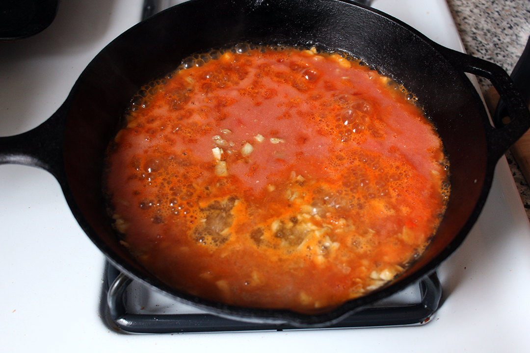 - Add the blended tomatoes to the pan with the sauteed garlic and simmer on low heat for 2 minutes.