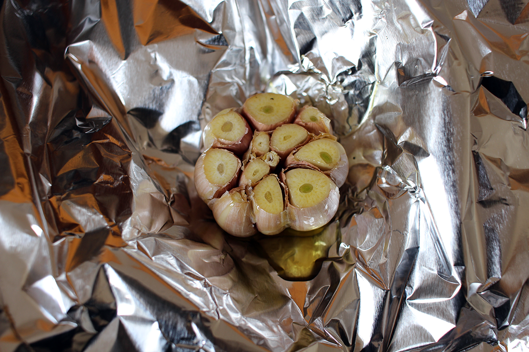 - Cut & discard the top layer of the garlic bulb, place in foil paper, cover in olive oil & close the foil.
